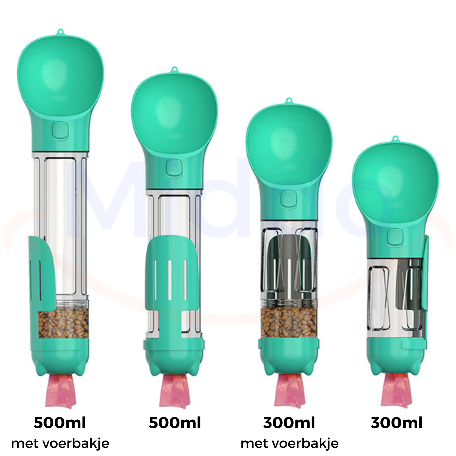 Selon la variante, la gourde peut contenir 300ml ou 500ml d'eau, avec un compartiment séparé pour la nourriture sèche.